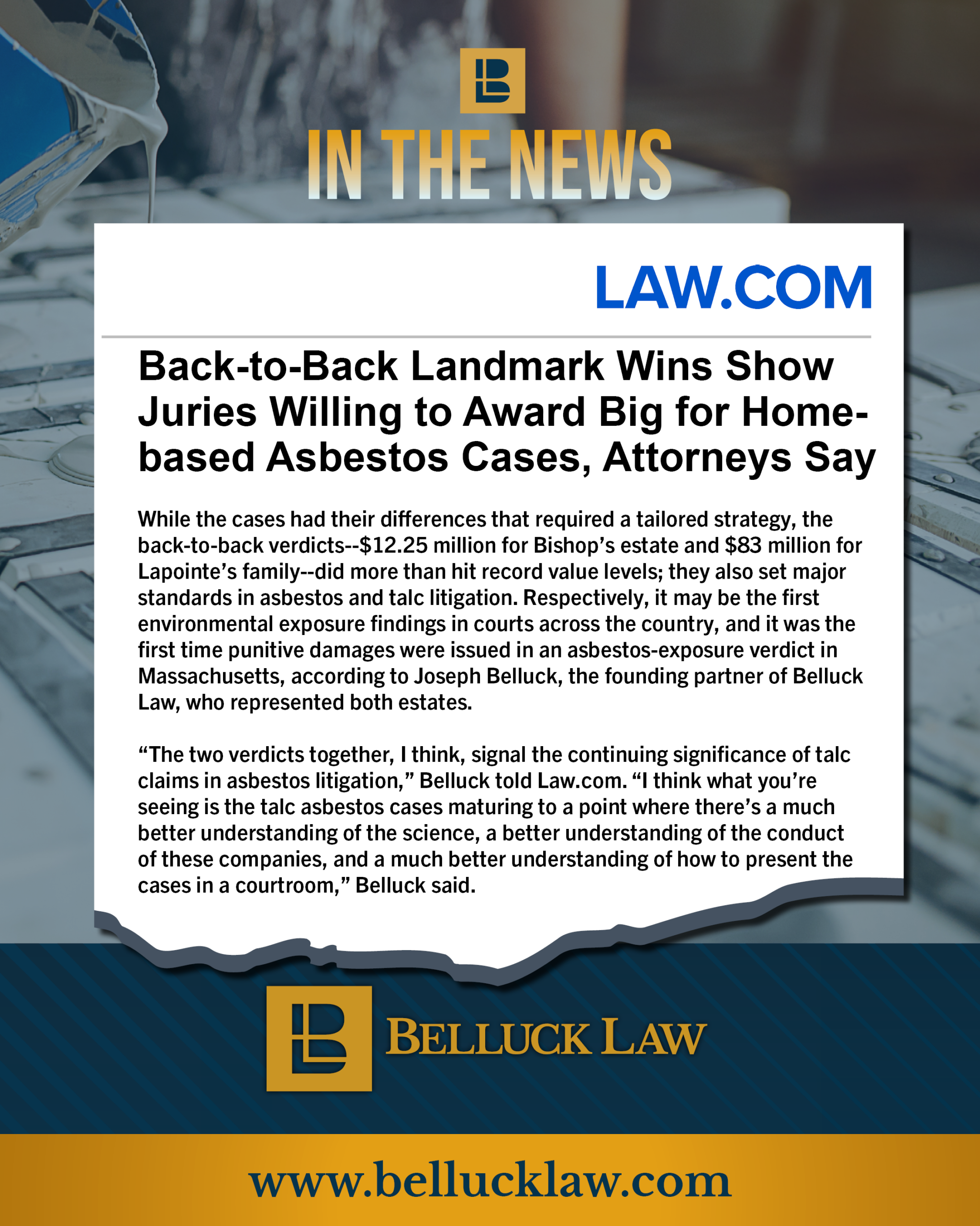 Two Belluck Law cases in the last month resulted in nearly $100 million awarded to two families by juries in Upstate New York and Massachusetts. Juries are showing an increased willingness to extend liability beyond the workplace exposure and against corporations that fail to warn about the health risks of their products.